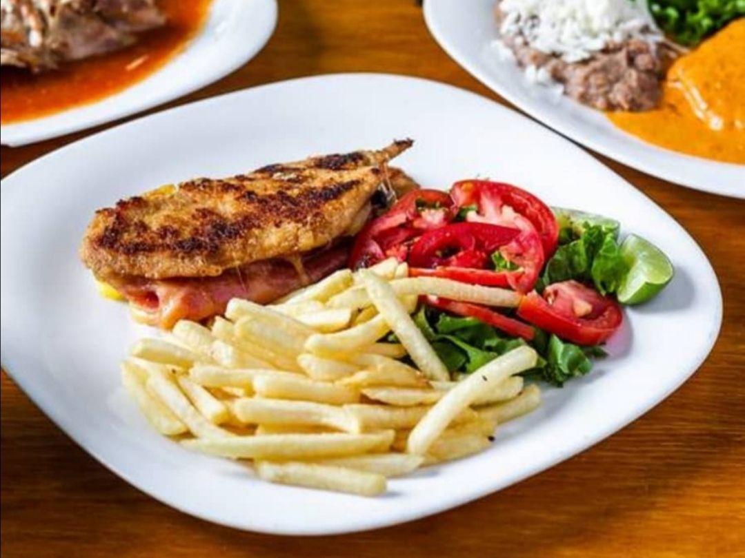 Pechuga empanizada rellena de jamón y quesos acompañada de ensalada y puré de papa.
