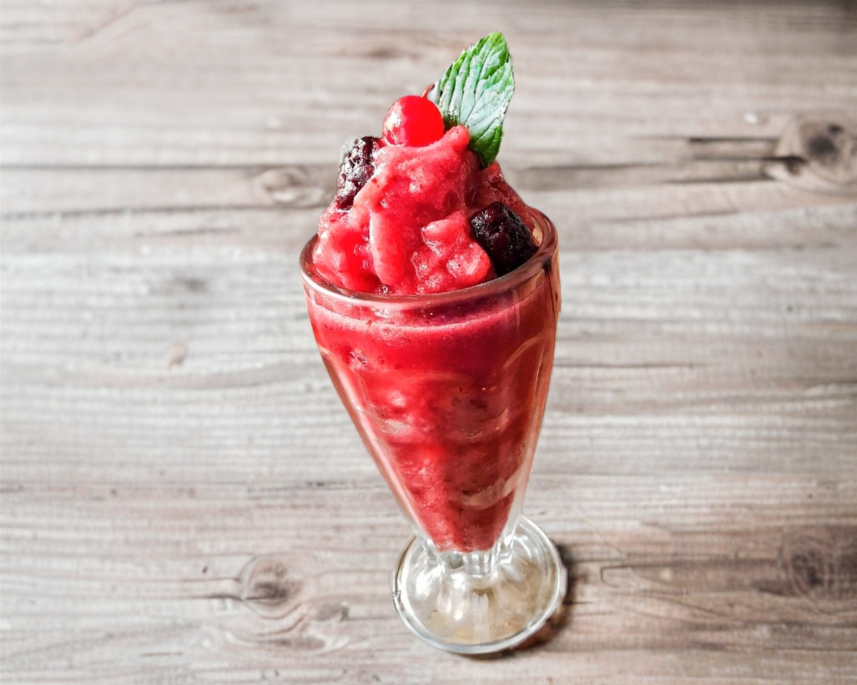 Bebida frappeada de 16oz sabor Frutos Rojos, a base de agua y decorada con chamoy, miguelito y banderilla de tamarindo.