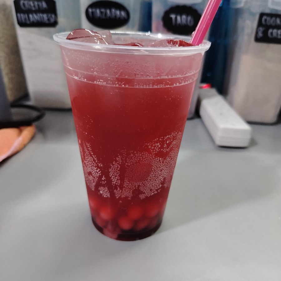 16oz de bebida sabor frutos rojos con agua mineral, perlas explosivas y hielos