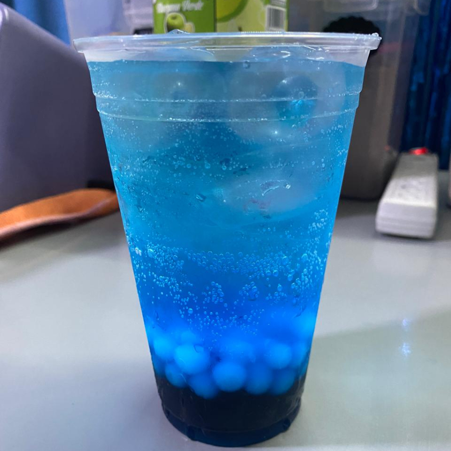 16oz de bebida sabor Mora Azul con agua mineral, perlas explosivas y hielos