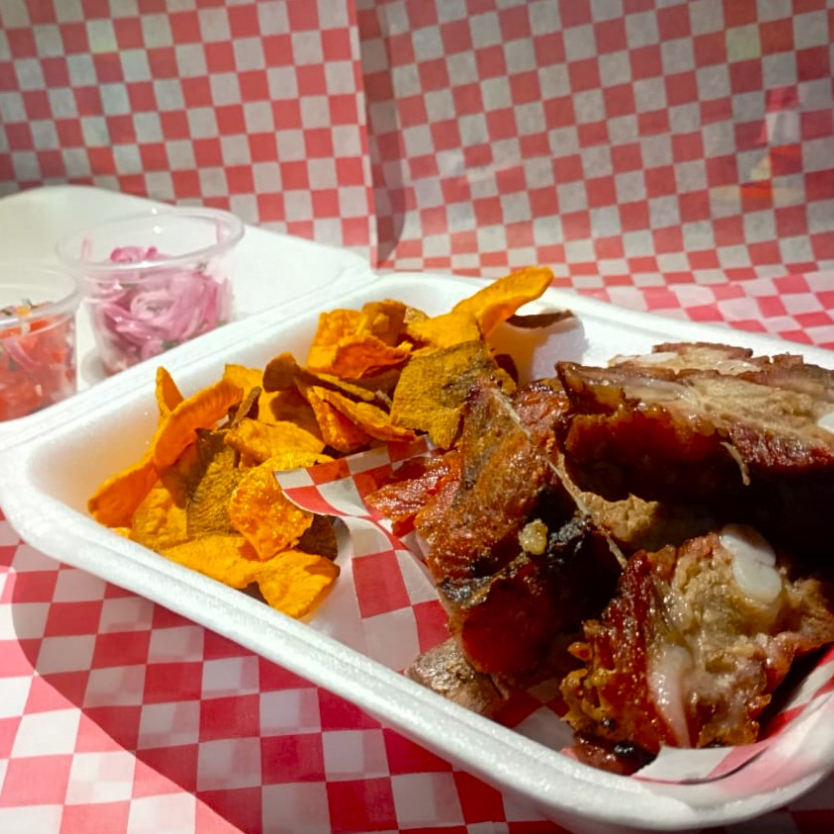 Costillas con guarnición de pico de gallo peruano y encurtido de cebollas con habanero. Opcional: camote frito o puré de papa.