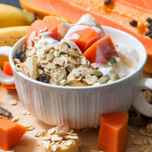 Manzana, fresa, plátano y papaya, acompañadas de granola y miel.