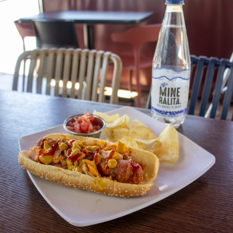 Hot Dog con trozos de piña, jamón y queso manchego gratinado acompañado de papas de hojuela.