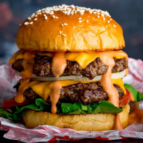 Pan brioche mantequilla, carne de res ahumada con madera de mezquite, acompañada de queso manchego americano, lechuga, jitomate, cebolla, y papas a la francesa.
