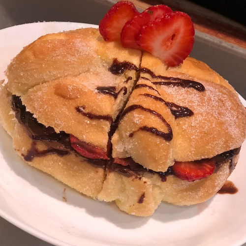Pan de mantequilla con arrachera acompañada de sofrito de champiñones, queso manchego, lechuga, jitomate y cebolla.