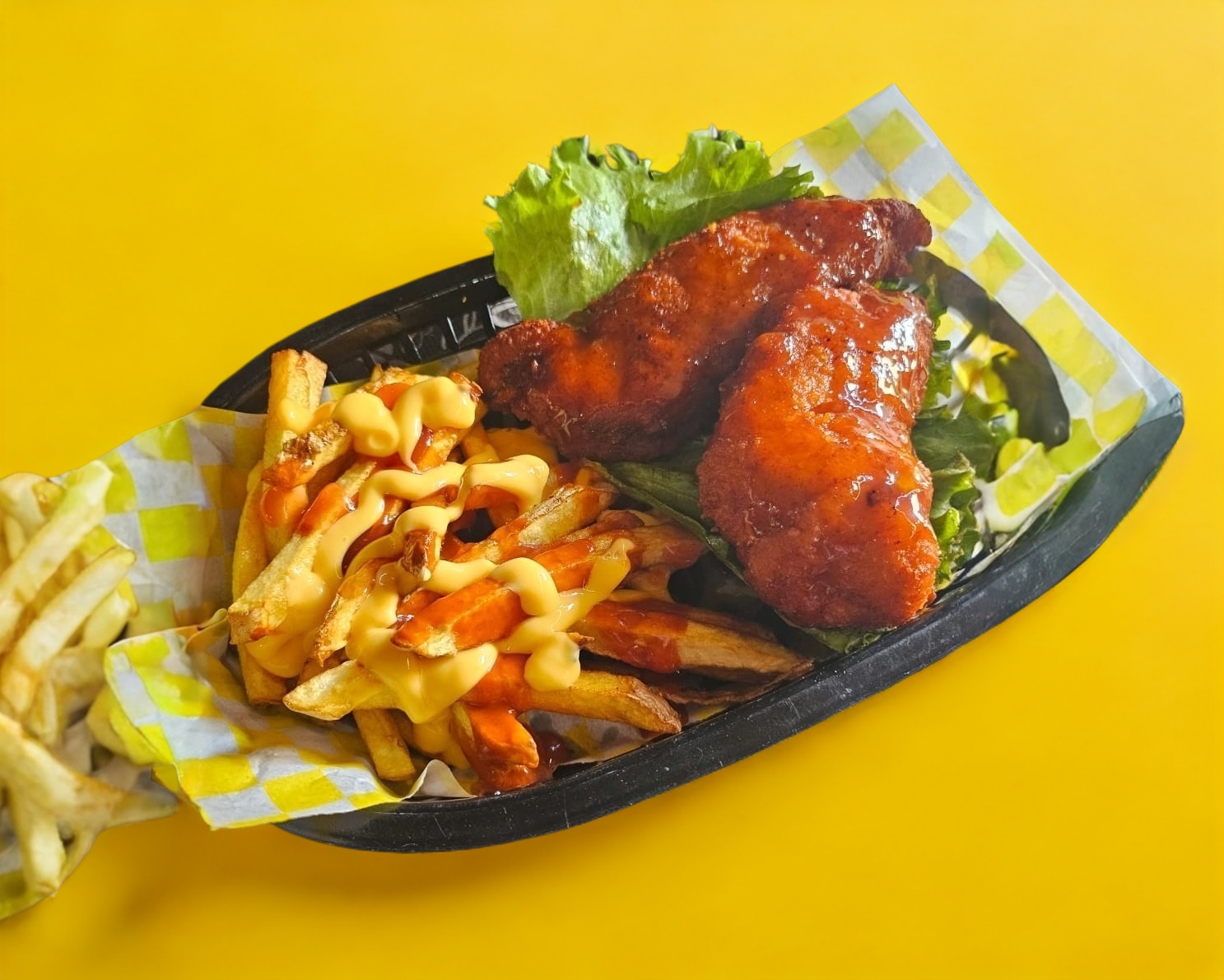 Medio de alitas, acompañadas de papas a la francesa.
