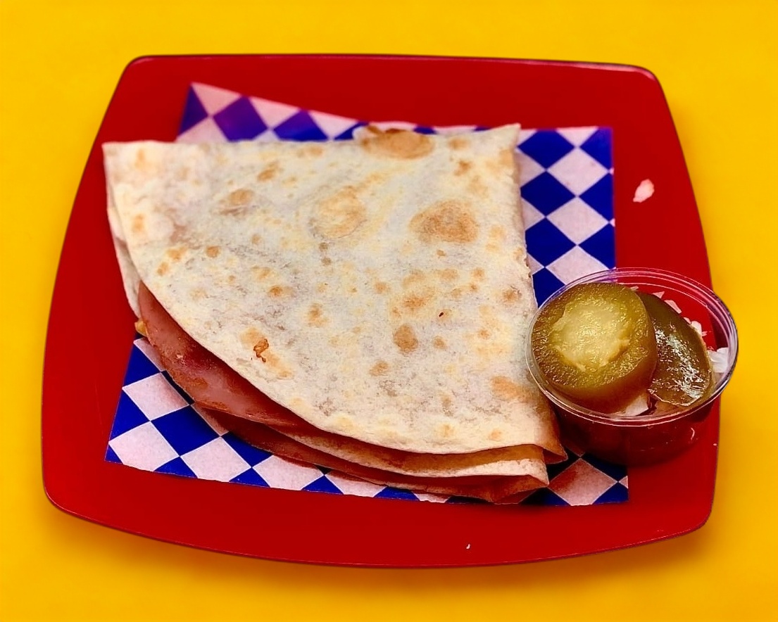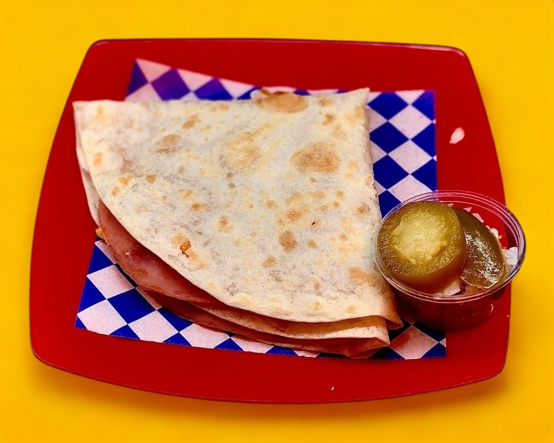 Tortilla de Harina de 30 cm doblada y rellena de jamon, queso amarillo y queso oaxaca