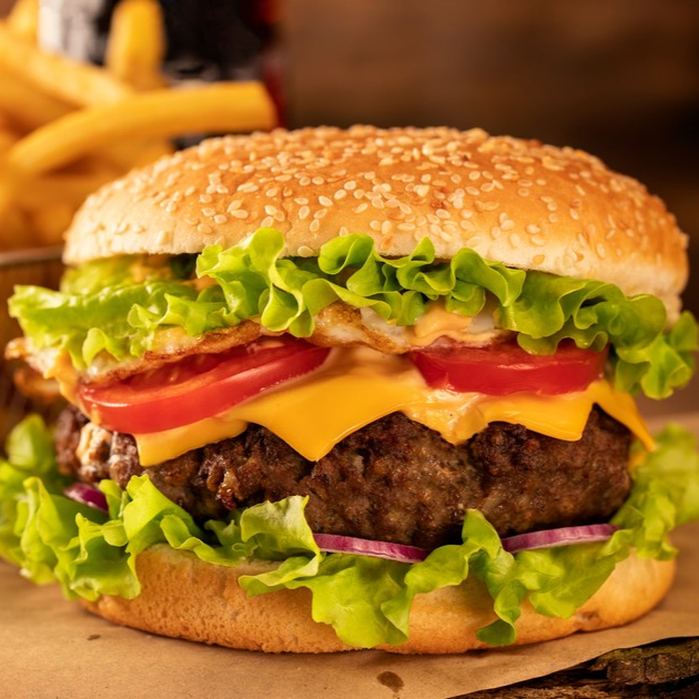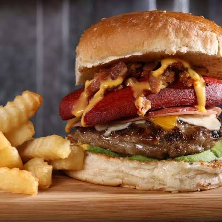 Hamburguesa con doble carne de res, doble tocino, noble queso amarillo, salchicha Fráncfort y mezcla de quesos de la casa , vegetales y aderezos