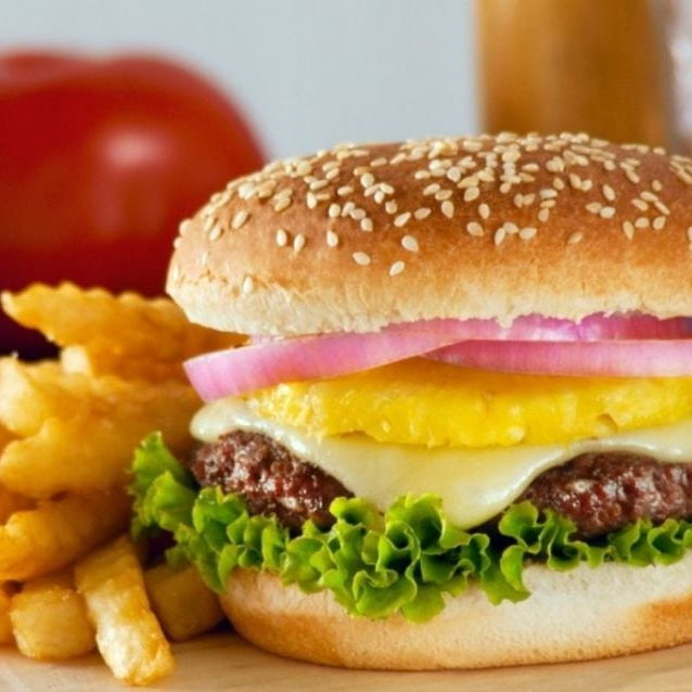 Hamburguesa de res más costra de quesos de la mezcla de la casa, jamón y piña más vegetales y aderezos