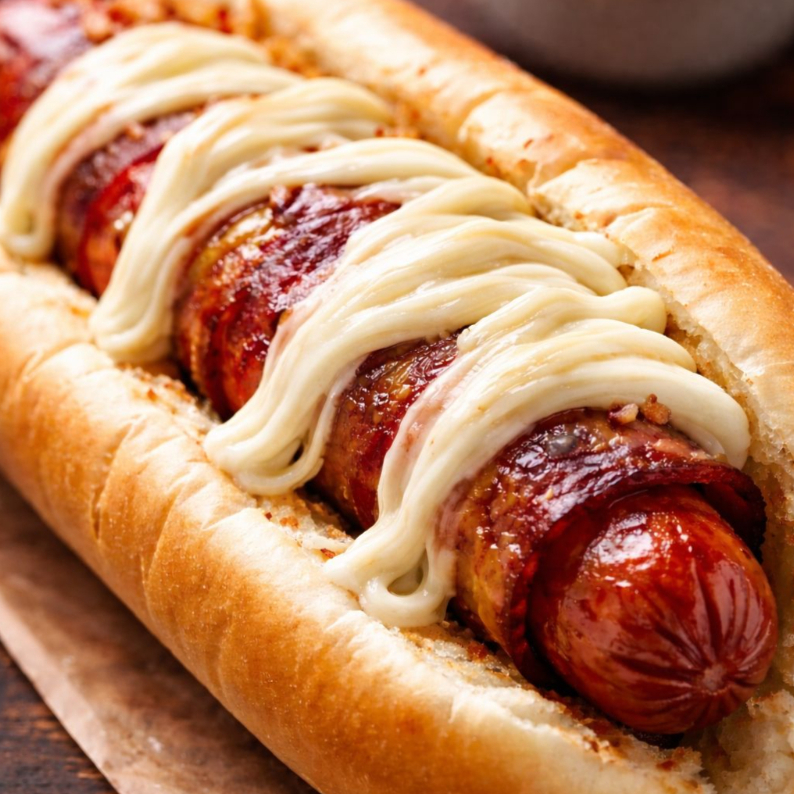 Delicioso Hot Dog acompañado con tocino, jamon y quesos de la casa