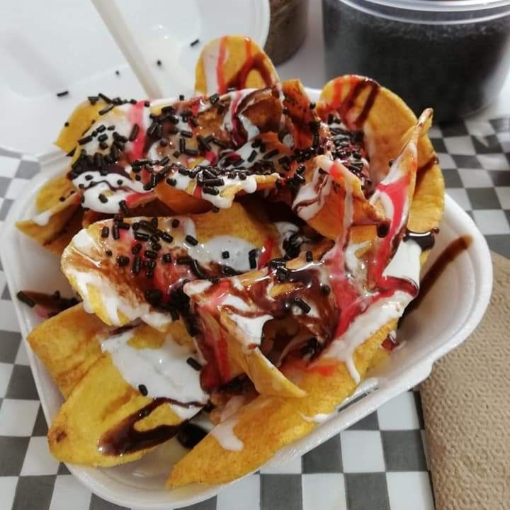 Nuestro postre estrella. Plátanos macho fritos y servidos con la irresistible combinación tradicional de crema fresca y leche condensada. ¡Un verdadero manjar!