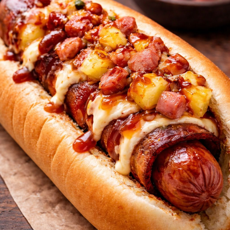 Delicioso Hot dog acompañado con queso,jamon y piña