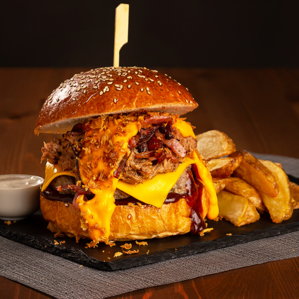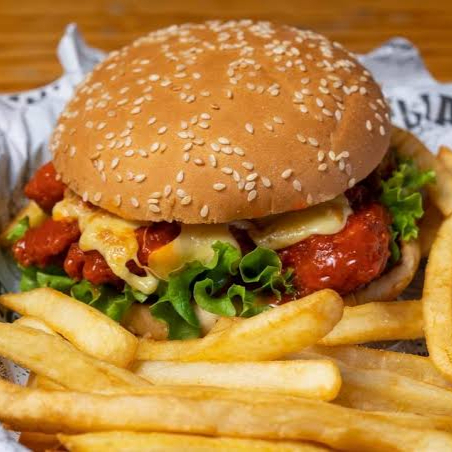 Hamburguesa con boneless ,tocino,costra de quesos y vegetales