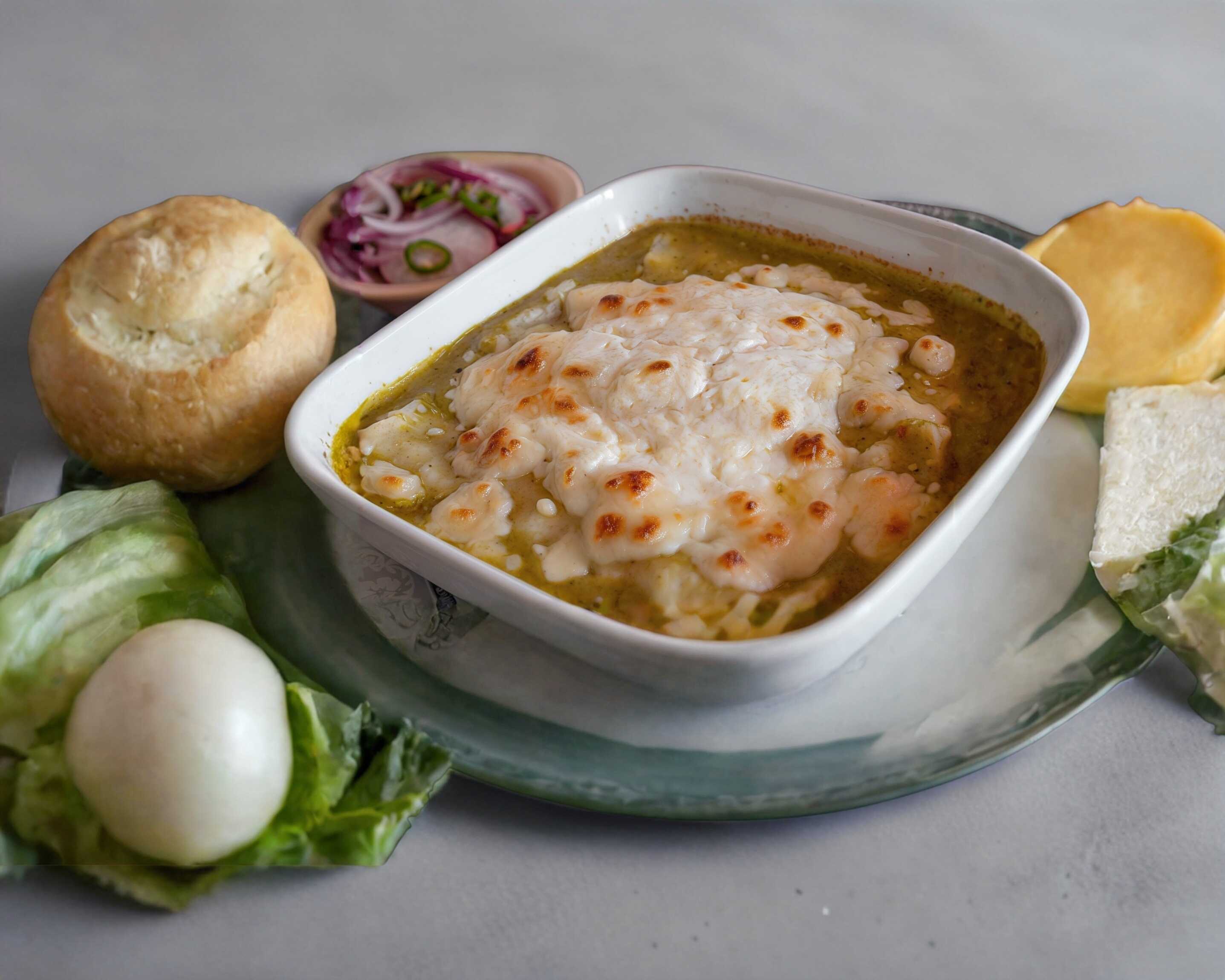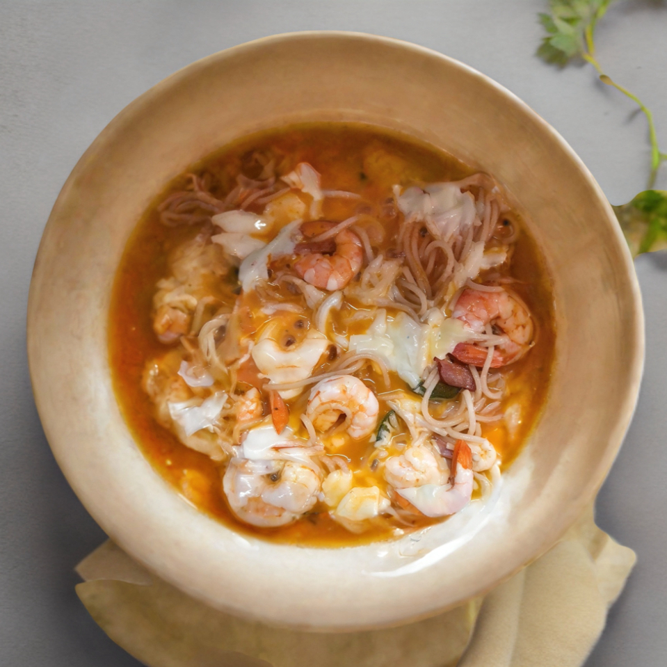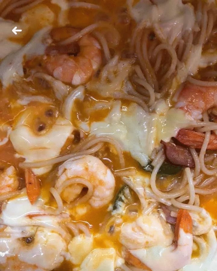 Lleva salsa italiana, camarones y queso gratinado.