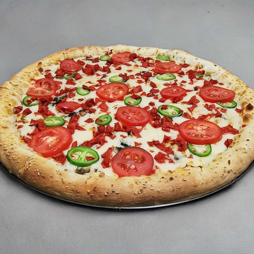 Lleva jamón, pepperoni, salchicha, salsa Italiana y queso gratinado.
