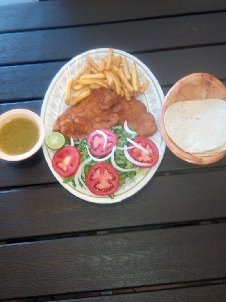 Lleva un filete de pechuga empanizada, ensalada romana, cebolla y papas a la francesa.