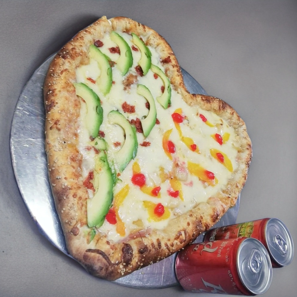 Lleva una pizza de tamaño grande en forma de corazón. De ingrediente a elegir.