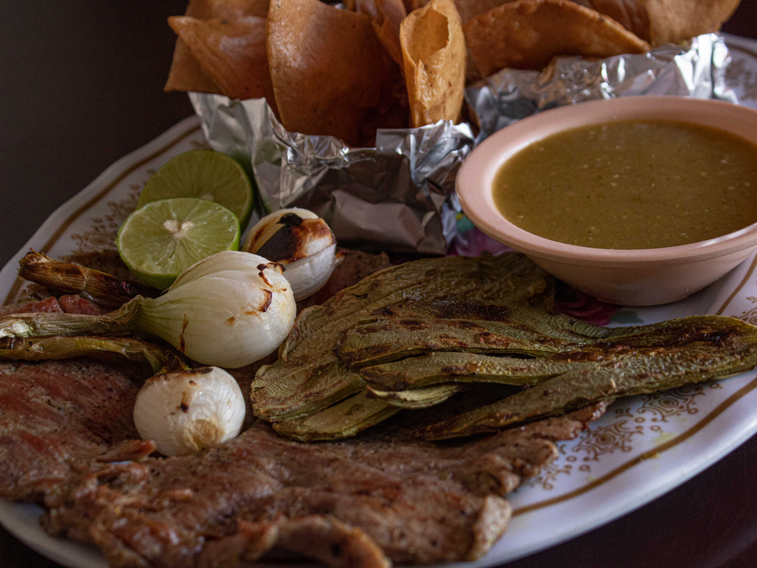 Lleva 250 gramos de arrachera, cebollitas, nopales, guacamole, frijoles y champiñones.