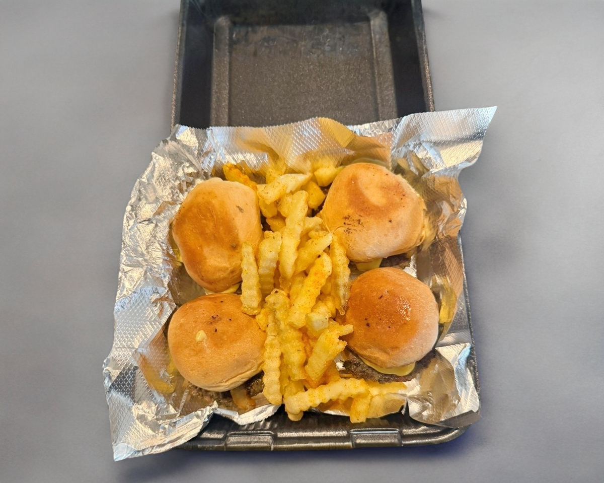 Combo de 4 boneles en una cama de lechuga zanahoria y pepino una hamburguesa sencilla y una porcion papas