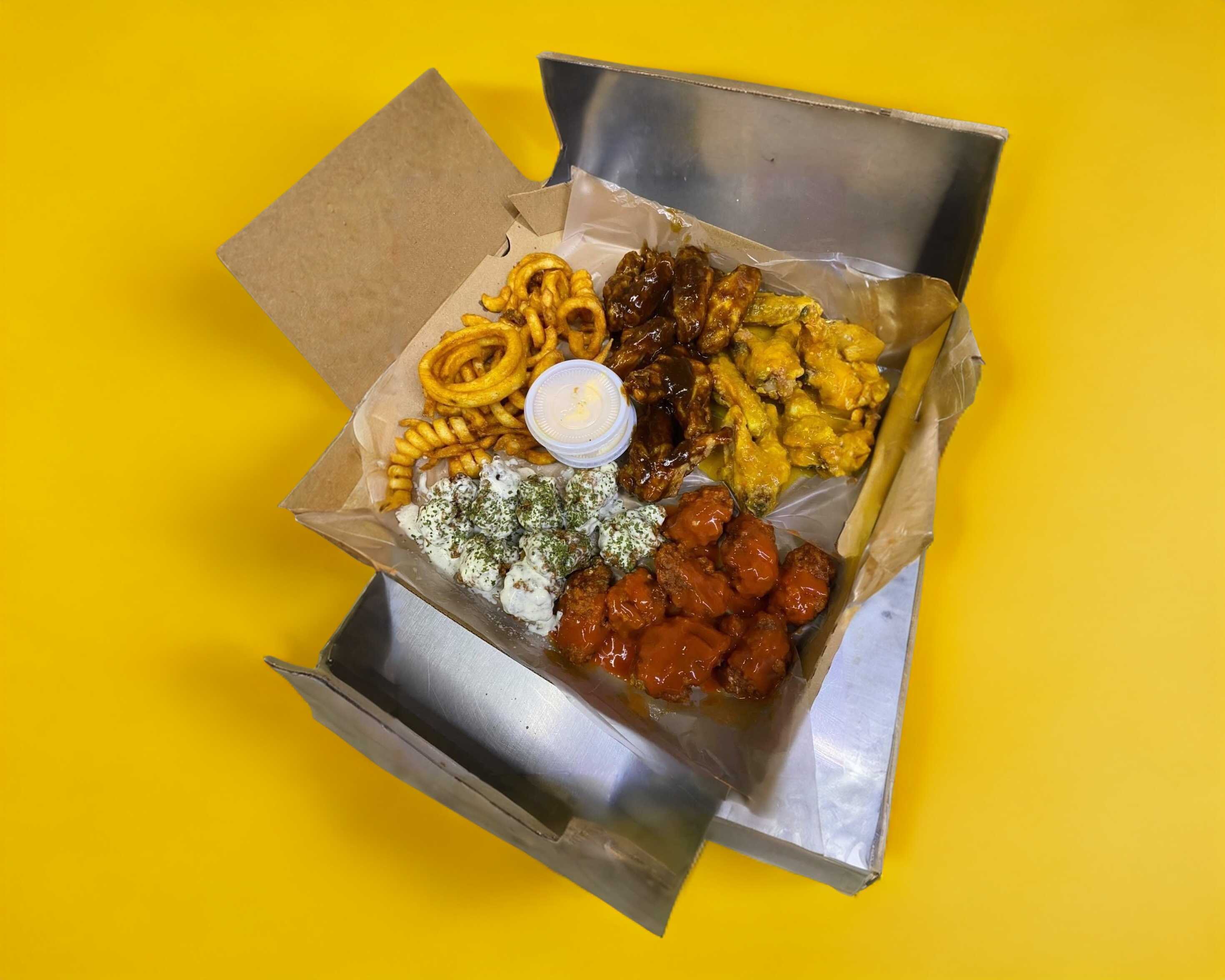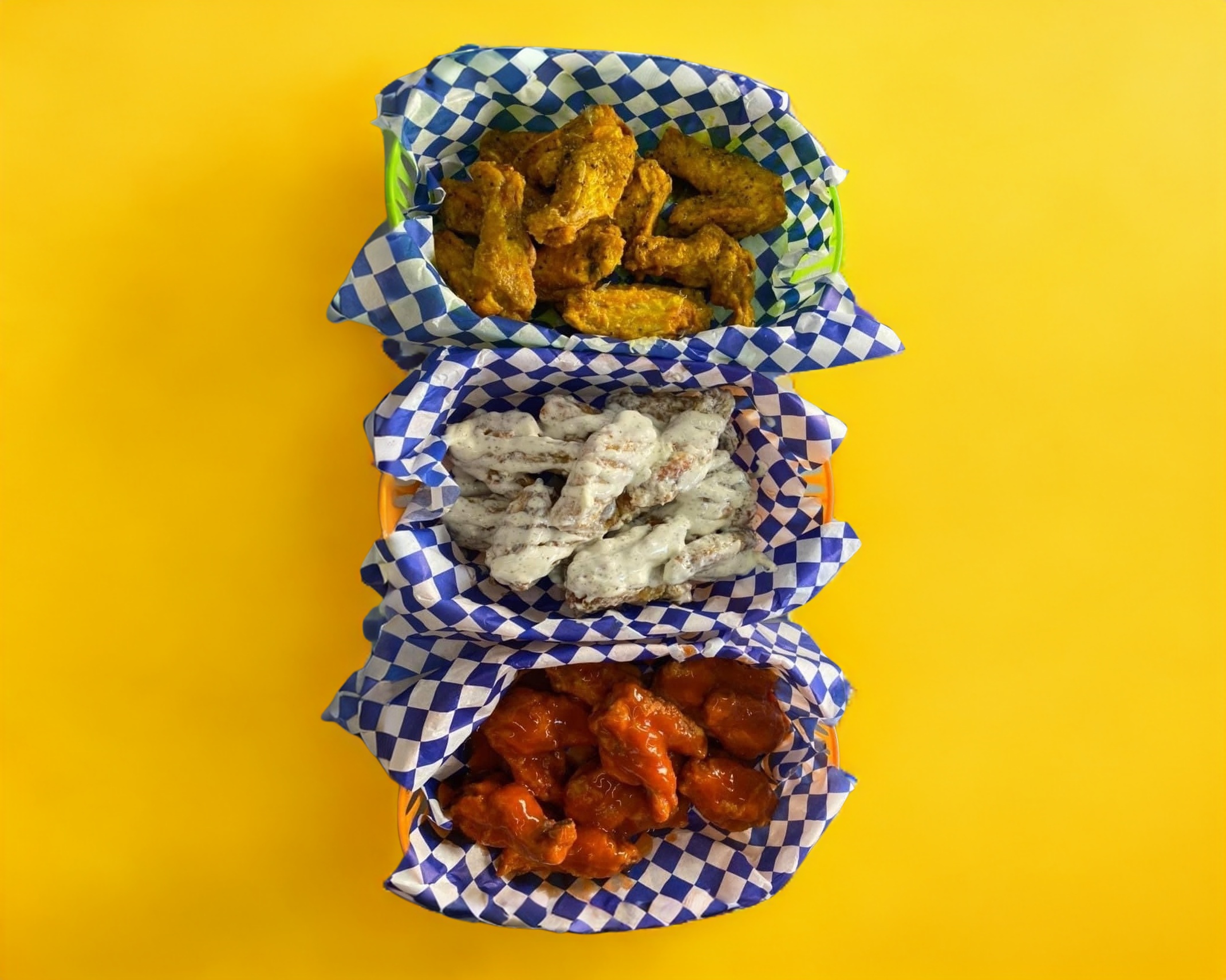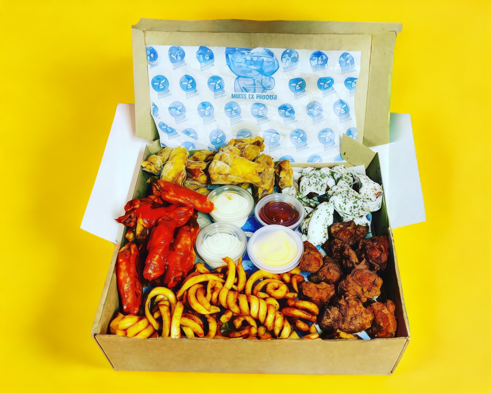 30 alitas y 3 salsas a elegir, 3 ordenes de papas, dedos de queso.