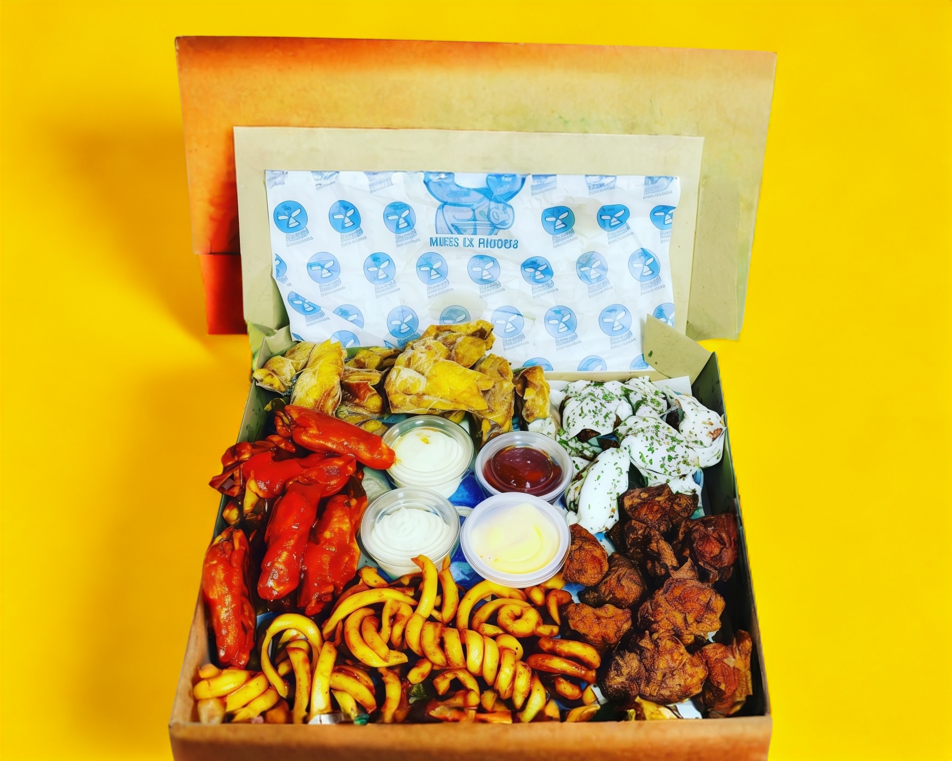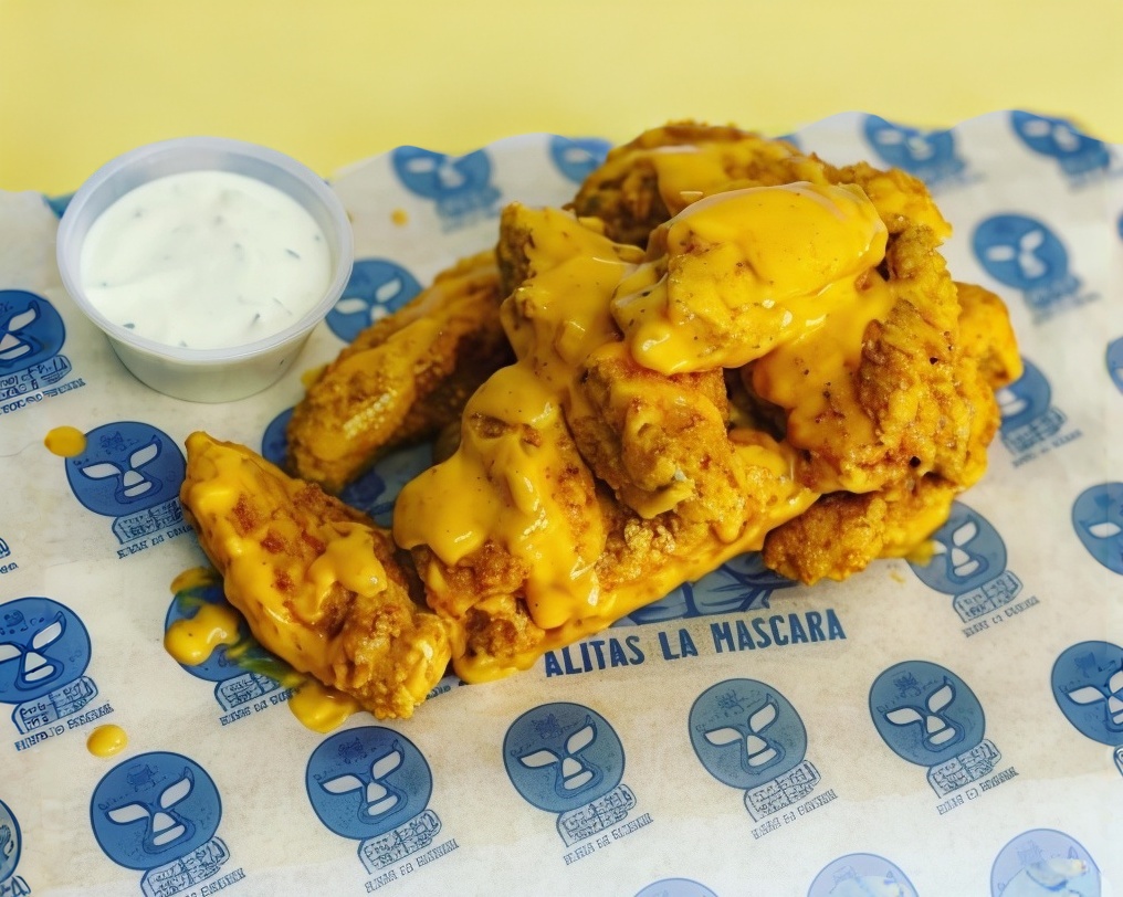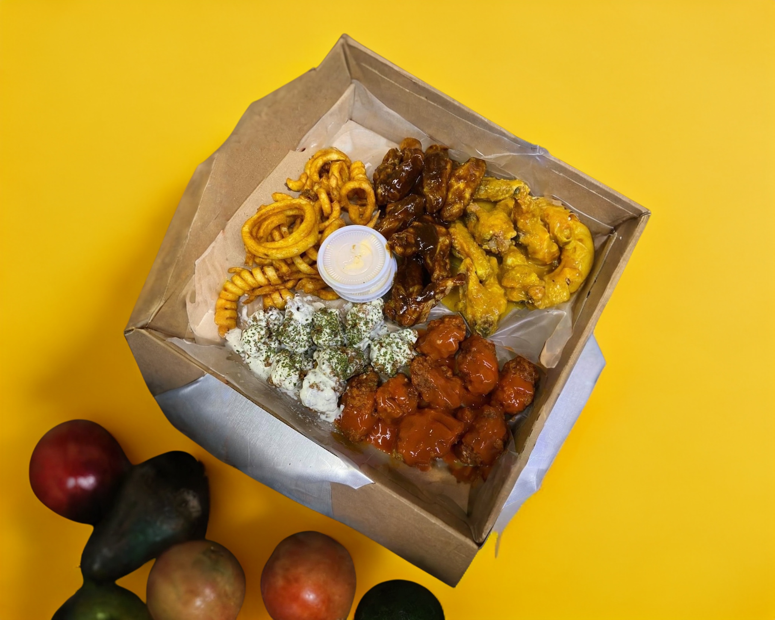 30 alitas y 3 salsas a elegir, 3 ordenes de papas, dedos de queso.