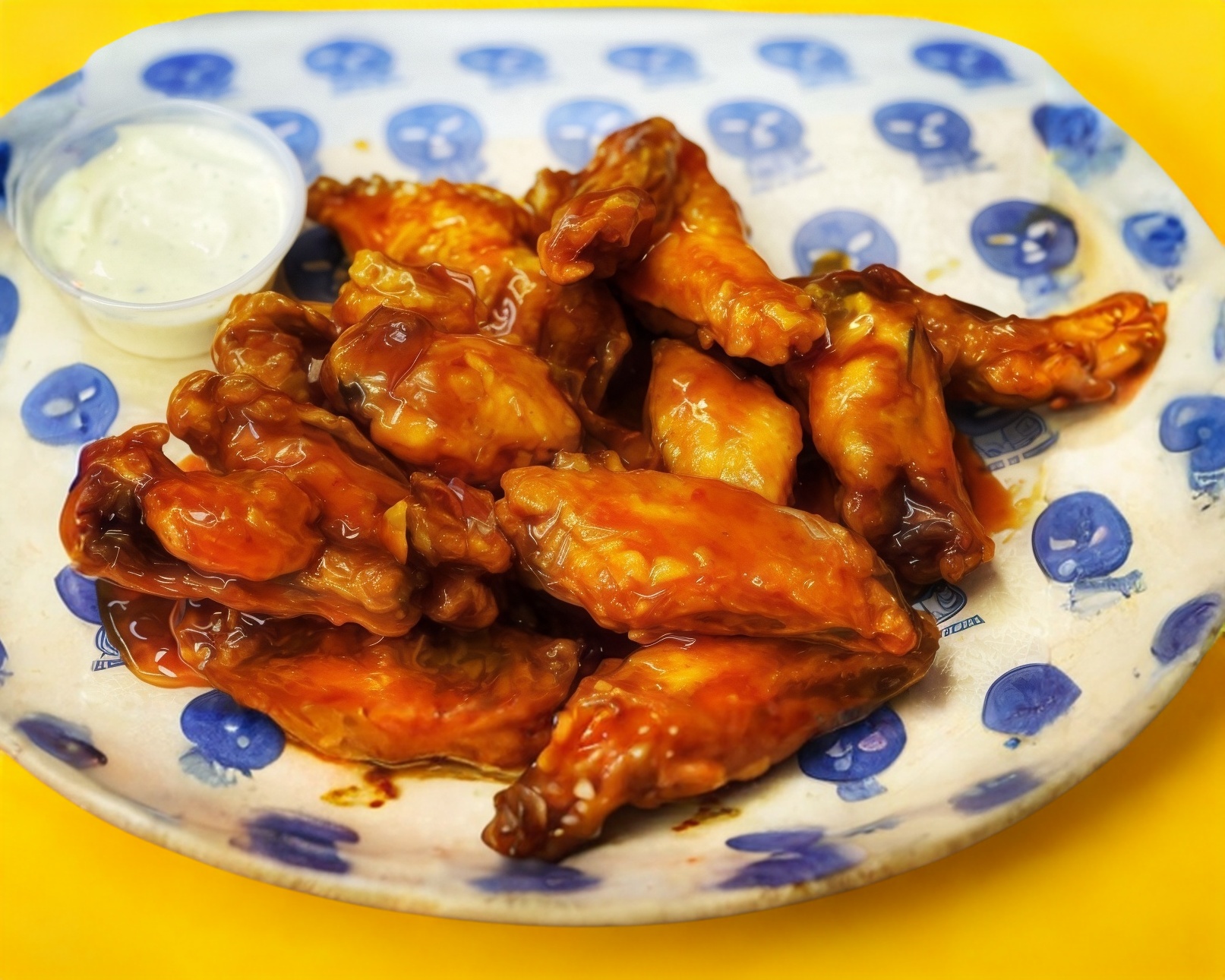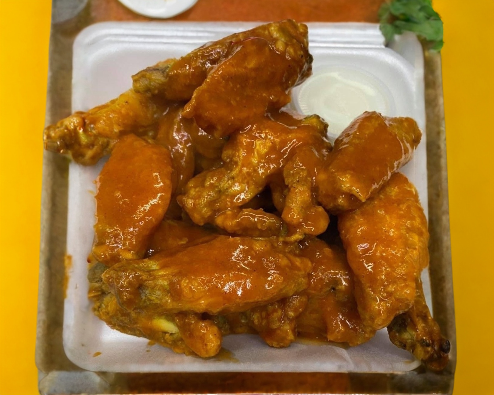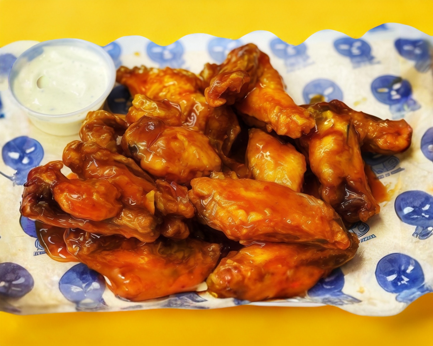 (Para máx 2 personas) Alitas 1 Kg ( peso en crudo ) (12 piezas), salsa a elegir( Mandarina Habanero Cajun Ruffles entreo otros ) , un adicional de aderezo Ranch.
