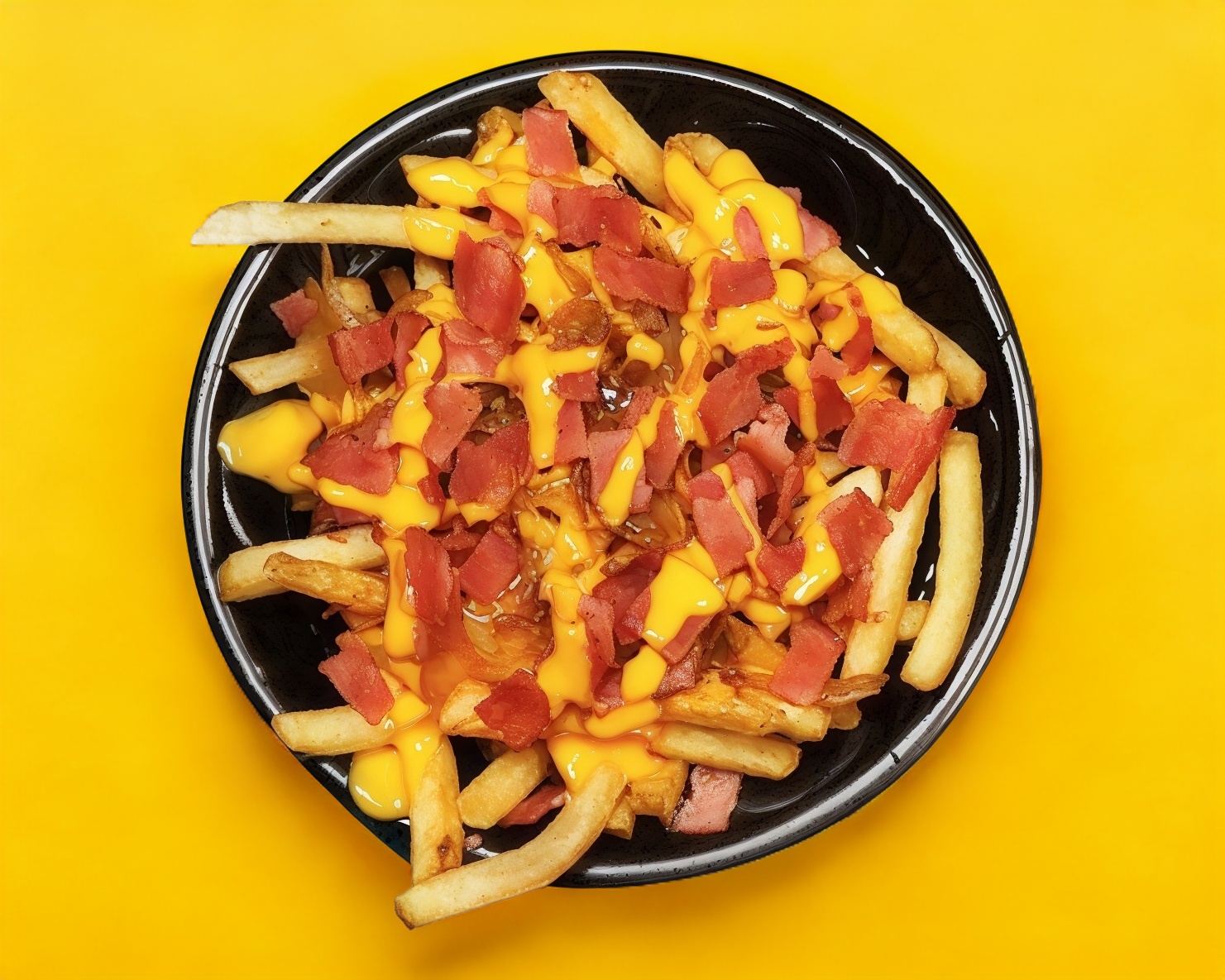 Papas a la francesa, salsa spicy cream y tocino deshidratado