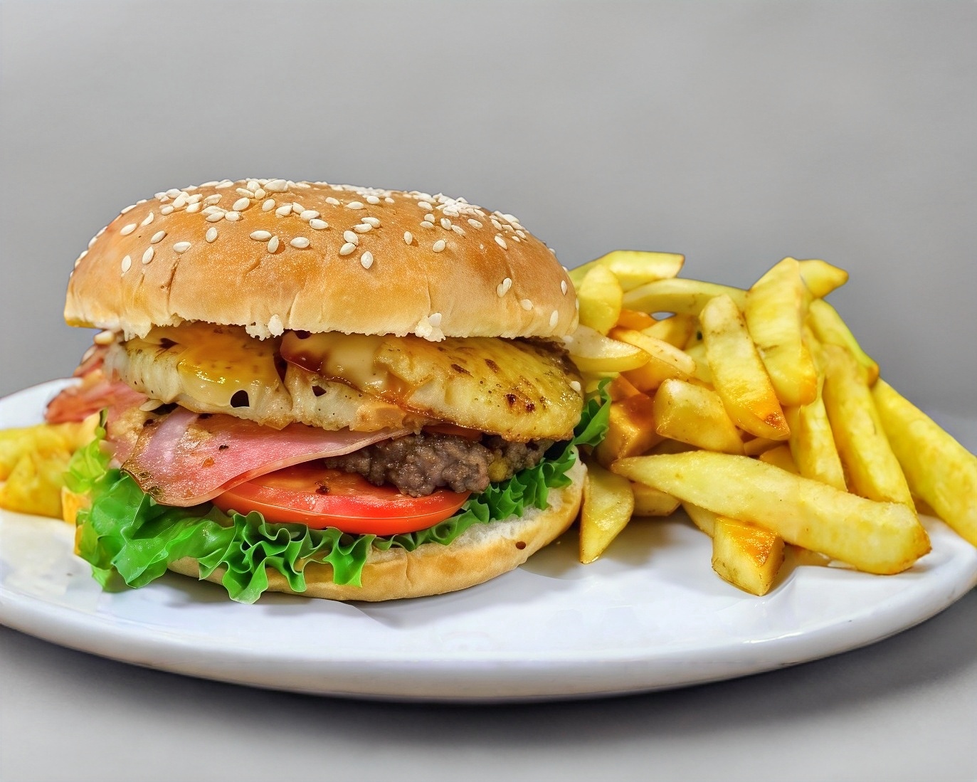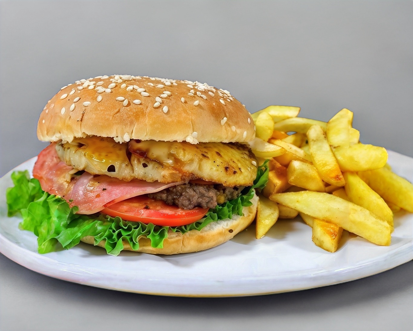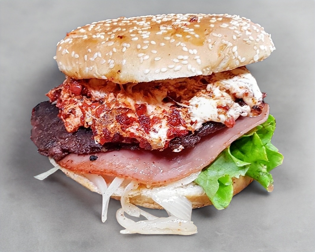 Pan, dos carnes de hamburguesa de pollo, jamón, queso Oaxaca, queso amarillo, lechuga, pepinillos, jitomate, rajas, cátsup, mostaza y aderezo.
