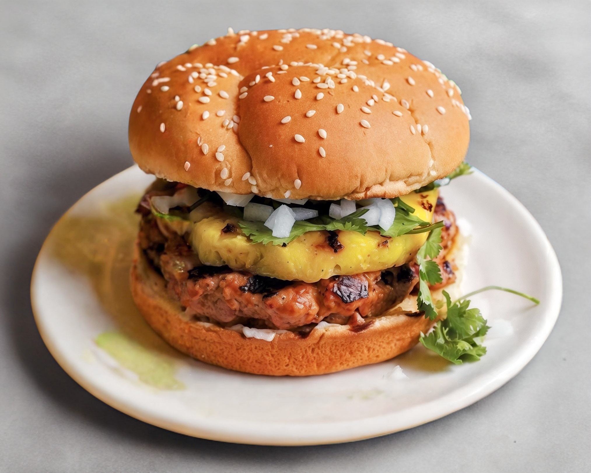 Pan, carne molida de res, jamón, queso amarillo, queso oaxaca, piña, lechuga, pepinillos, jitomate, rajas, cátsup, mostaza y aderezo.