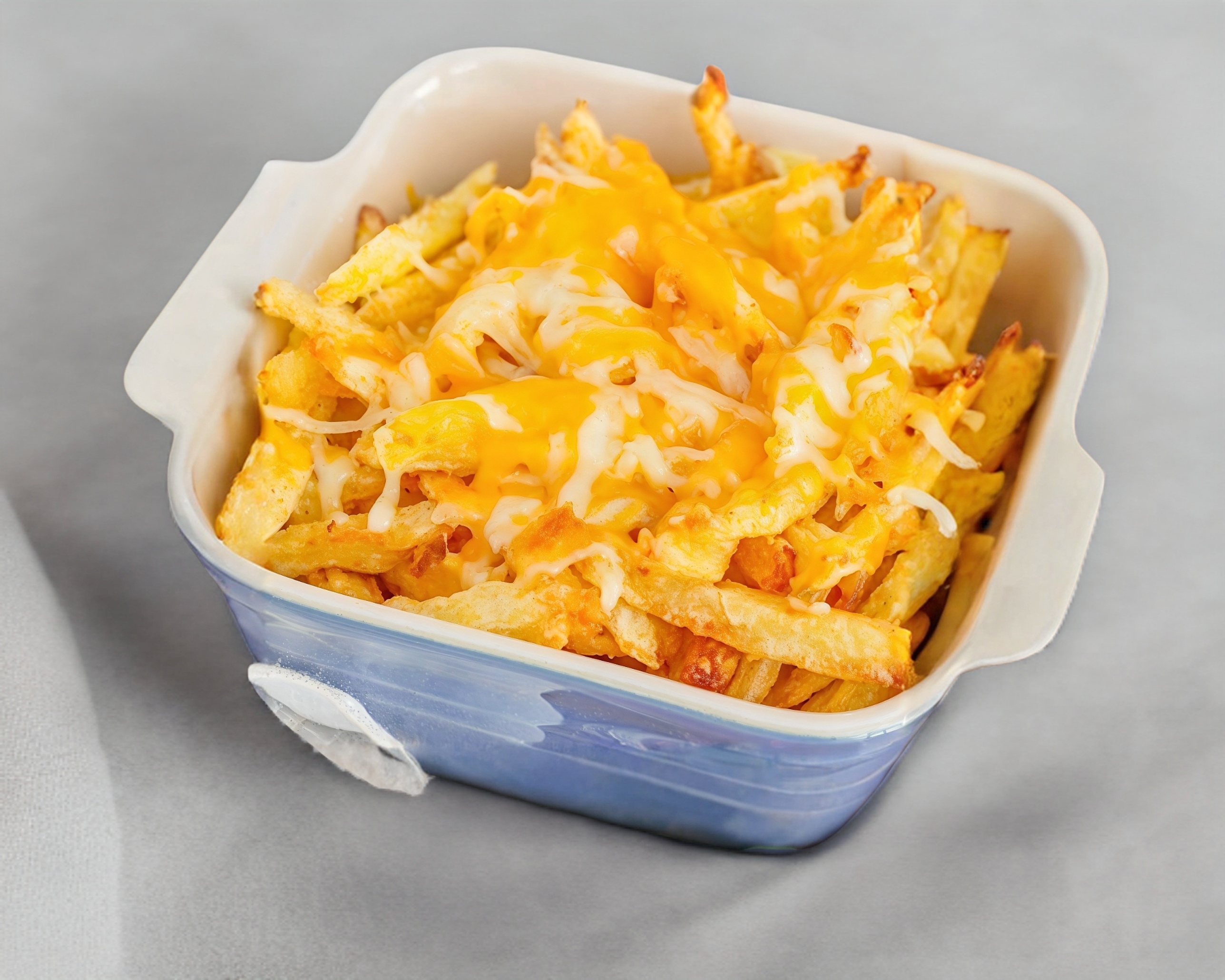 Papas naturales en tiritas con salchicha, queso Oaxaca, cátsup y queso amarillo líquido.