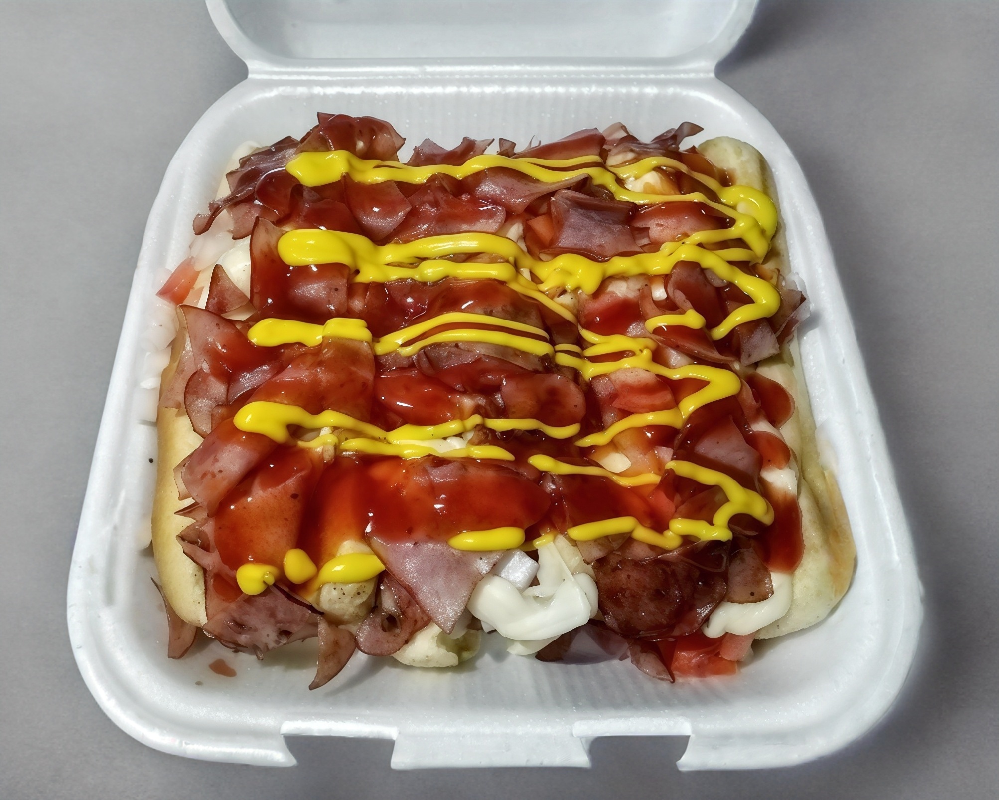 Pan, carne molida de res, jamón, queso amarillo, queso Oaxaca, lechuga, pepinillos, jitomate, rajas, cátsup, mostaza y aderezo. Las papas van con cátsup y queso amarillo líquido.