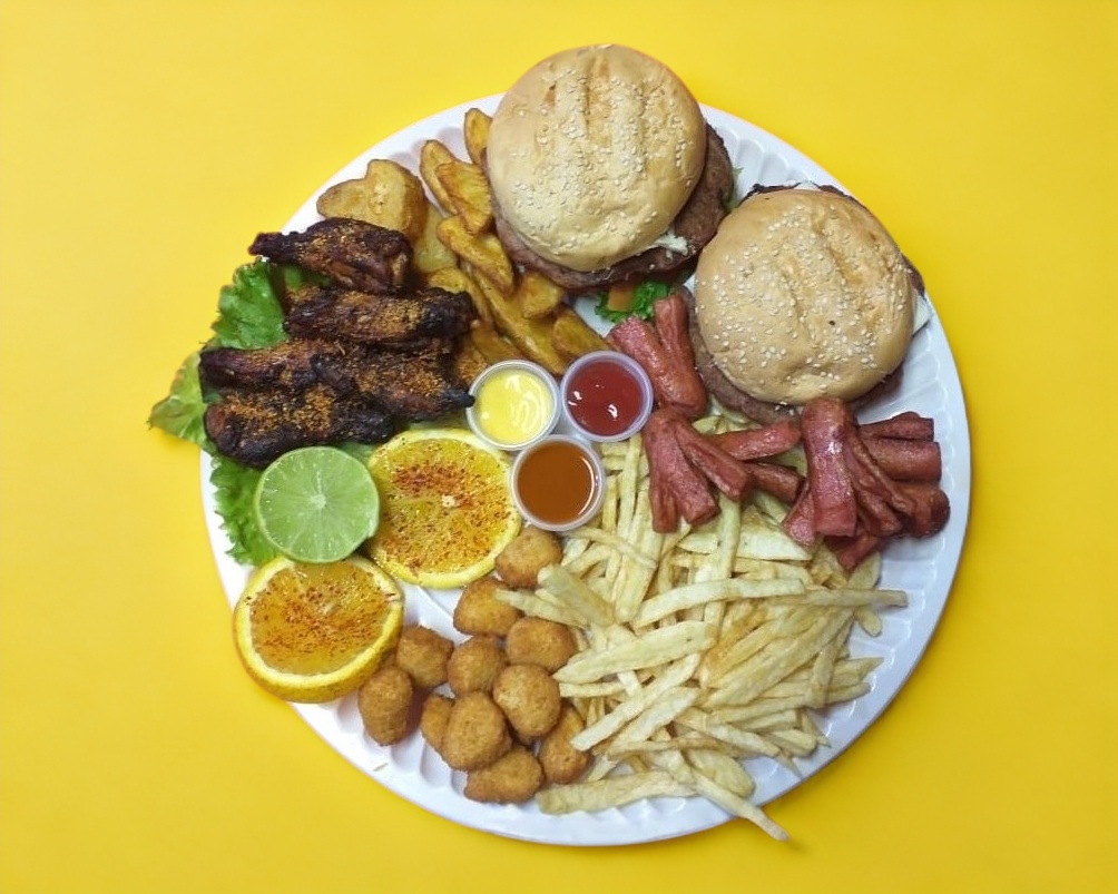 Dos hamburguesas sencilla y papá gajo papá a la francesa, nuguet de pollo, salchipulpos 5 alitas ala BBQ.
