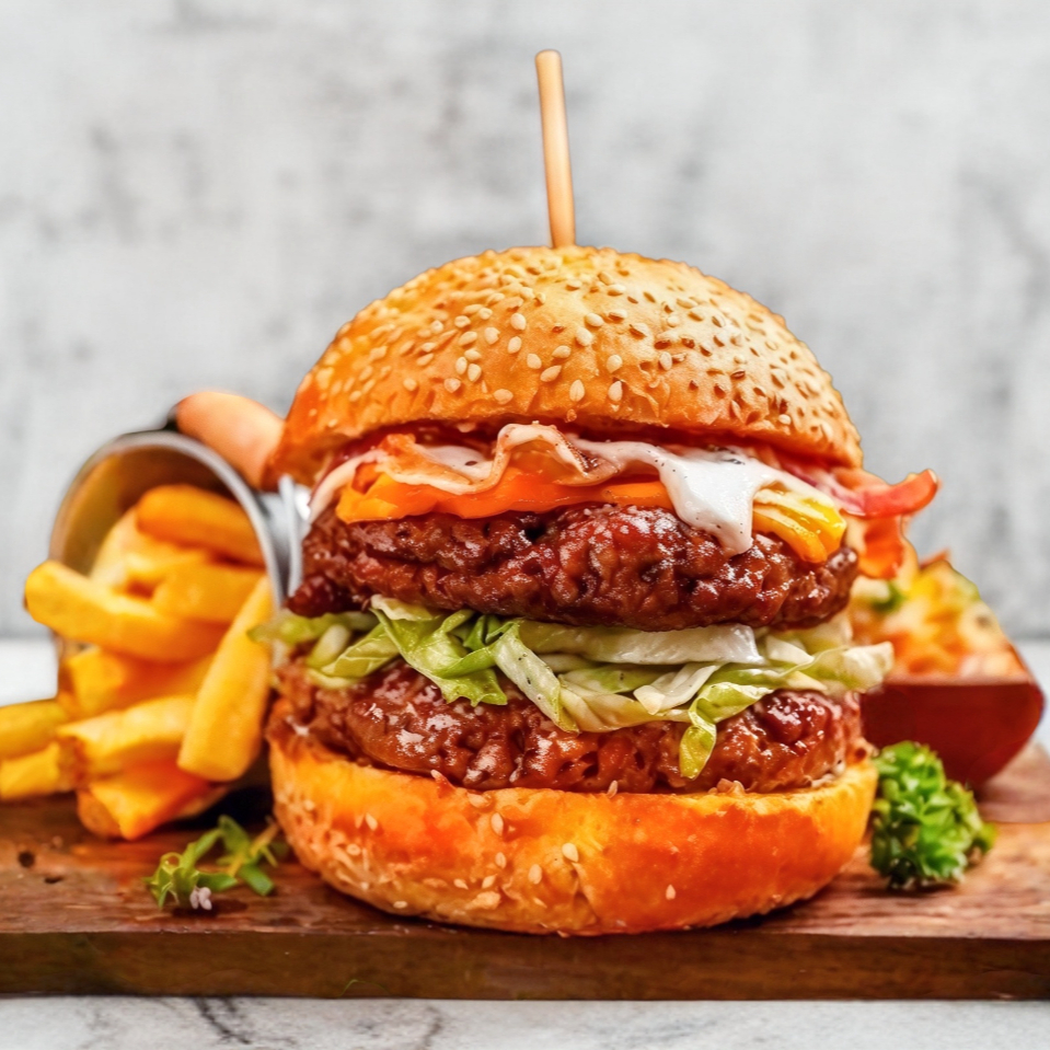 (platillo personal )Doble carne de res doble queso ,salsa BBQ jitomate cebolla lechuga y jalapeños y papas a la francesa gratis.