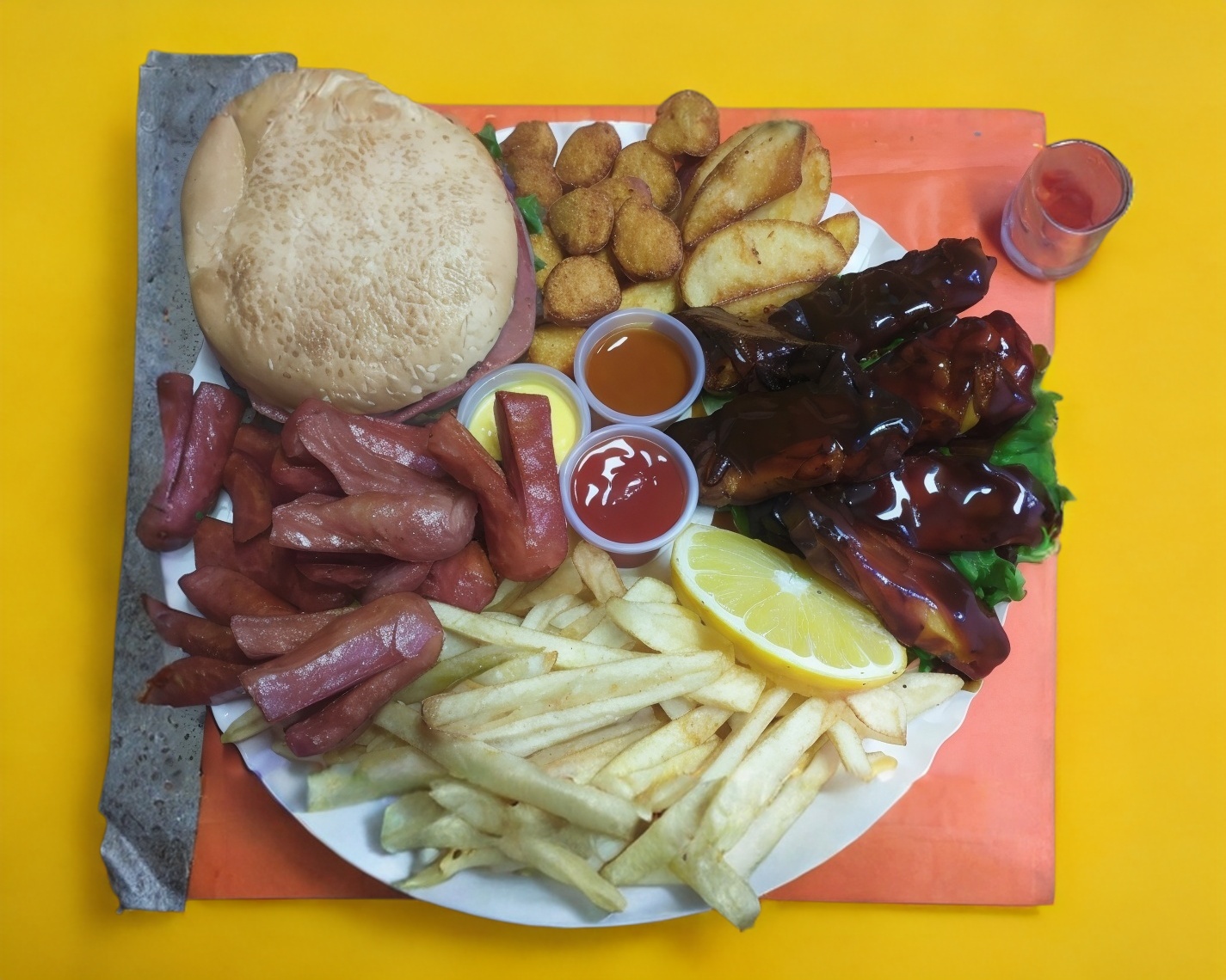 Hamburguesa sencilla 100% de res papá gajo , salchipulpos, papá ala Francesa , nuguet de pollo y 5 alitas BBQ.