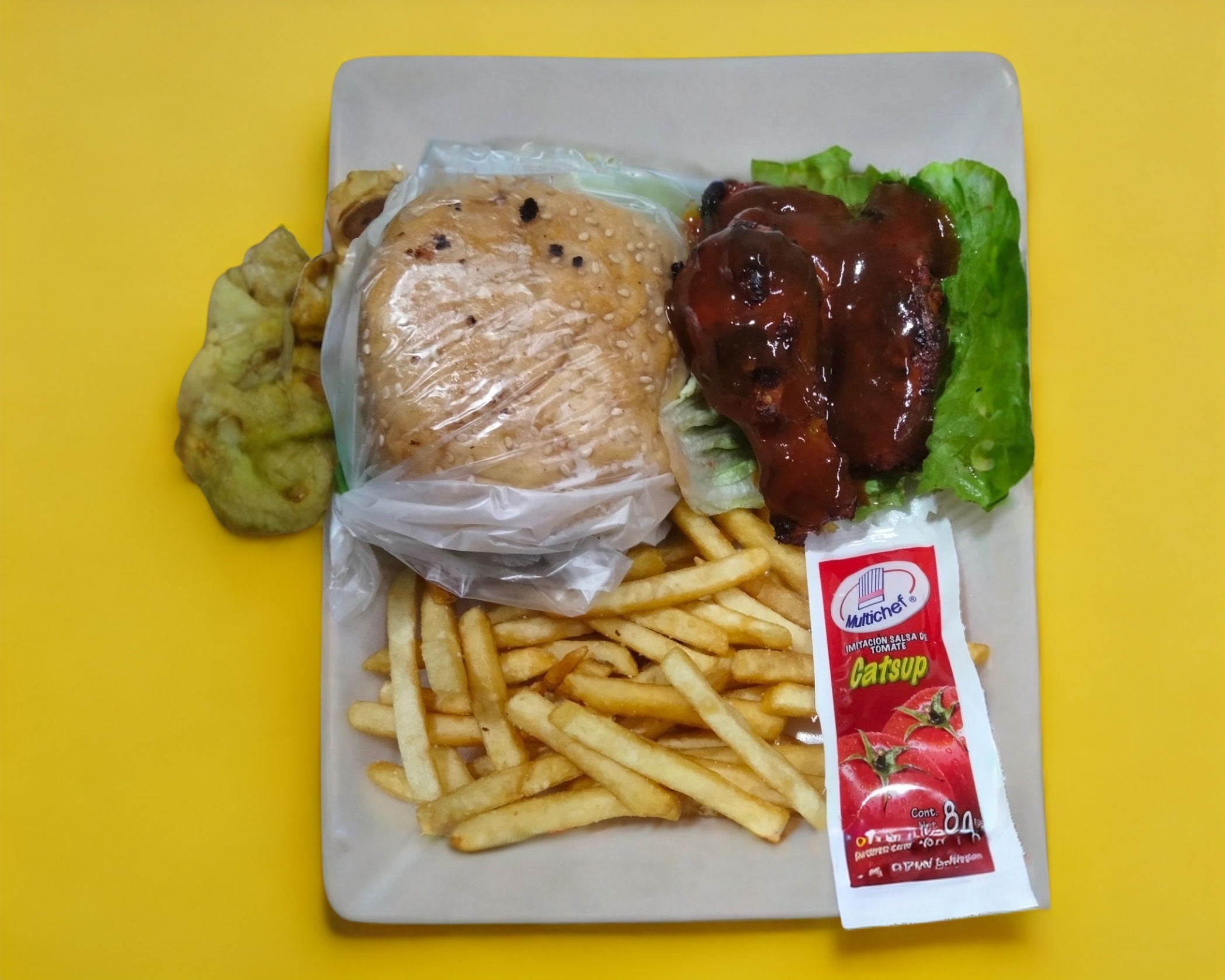 Hamburguesa de pollo con salsa de mango habanero lechuga jitomate cebolla y papas a la francesa