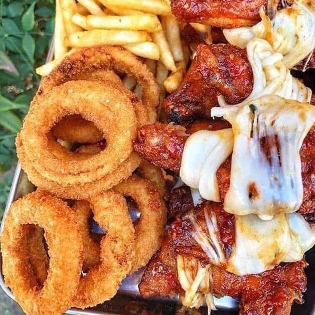 20 Alitas al carbón bañadas en salsa mango habanero acompañadas con papa ala francesa , zanahoria y pepino.