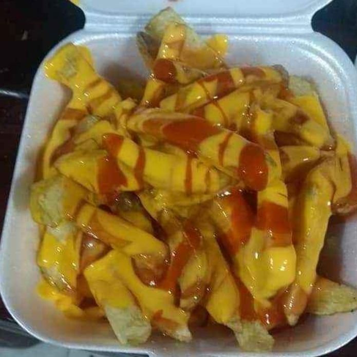 Papa en forma de gajo acompañadas de queso amarillo y salsa cátsup.