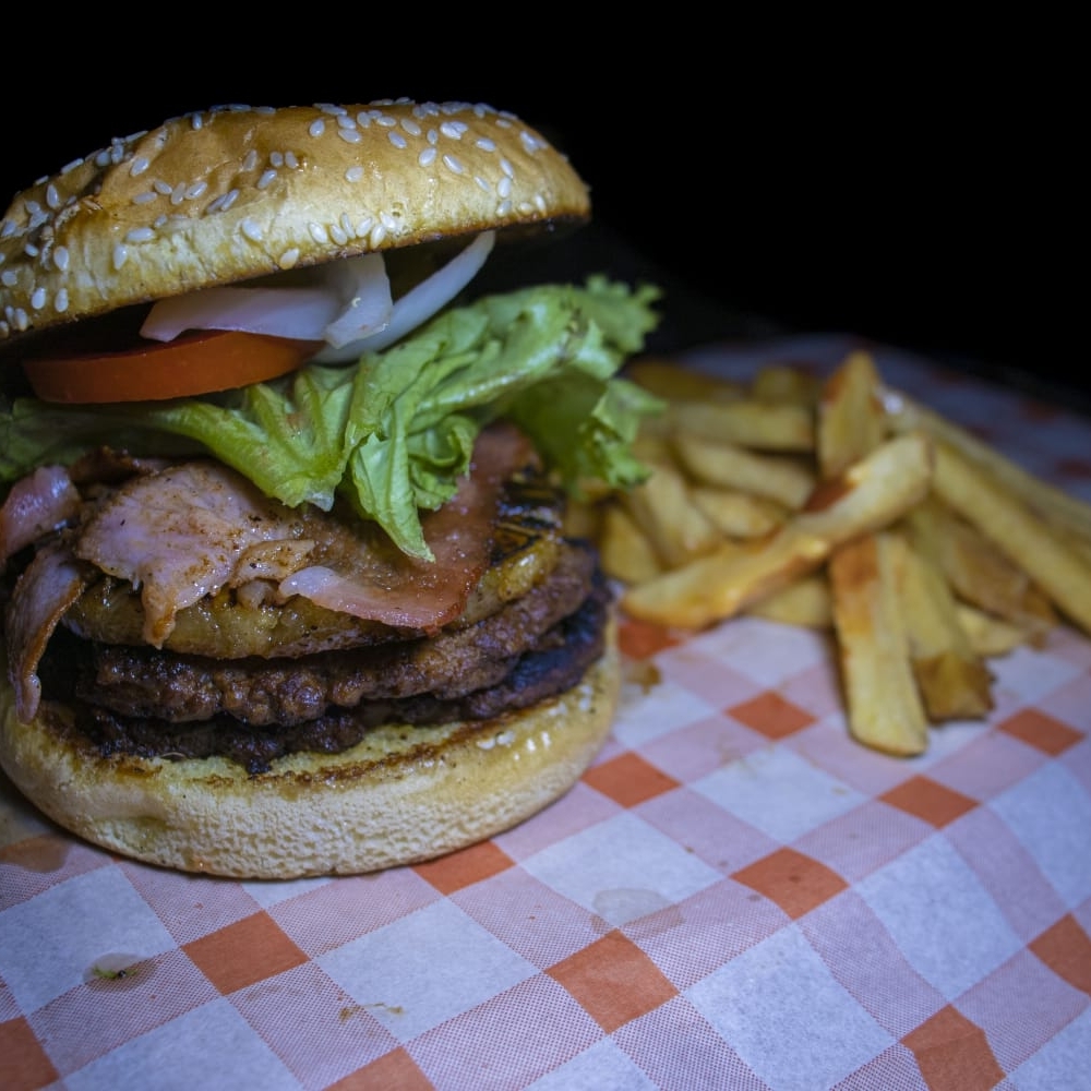 HAMBURGUESA DE RES, PIÑA, QUESILLO, JAMÓN,TOCINO, Y VERDURAS, ACOMPAÑADA DE PAPAS A LA FRANCESA