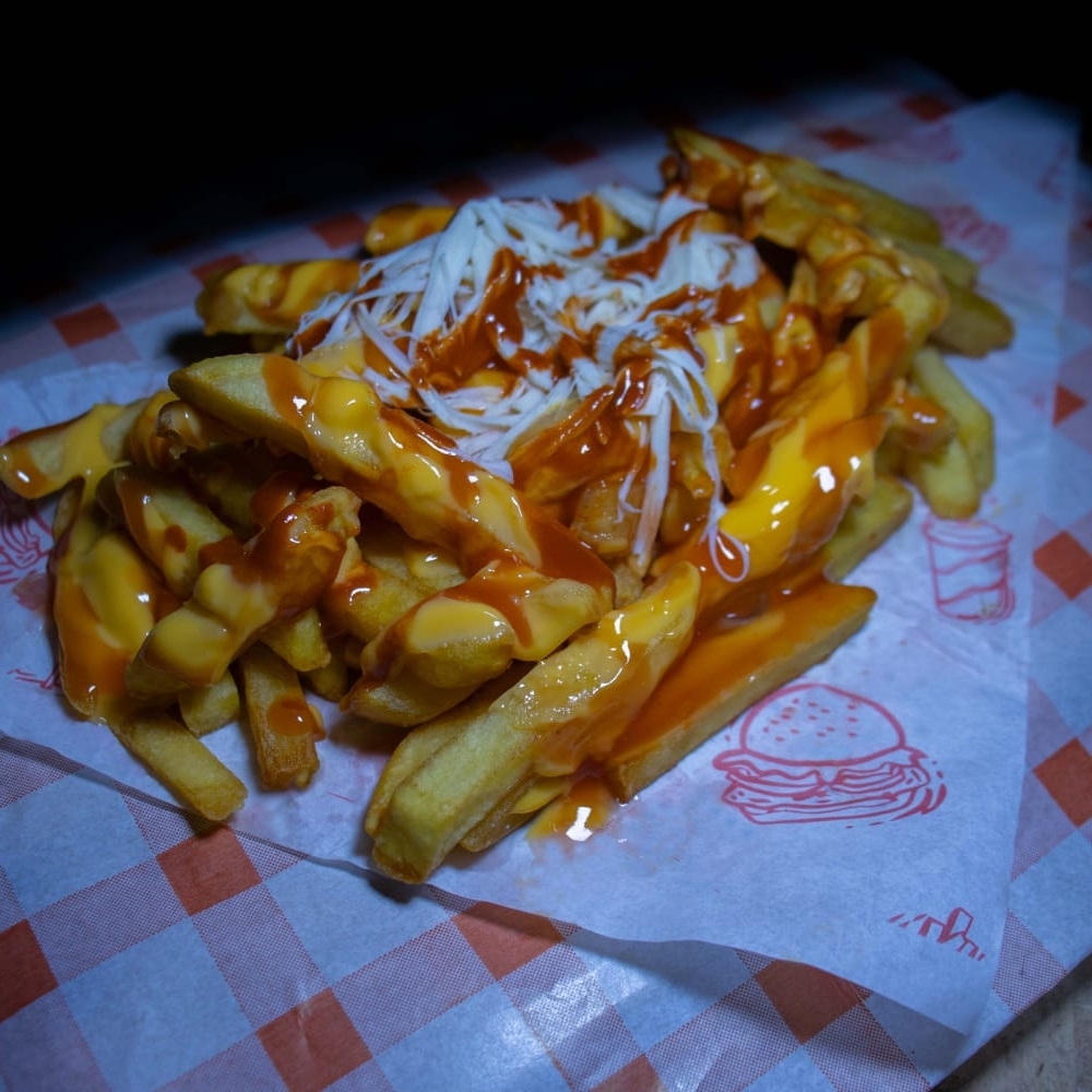 PAPAS A LA FRANCESA ACOMPAÑADAS DE QUESO AMARILLO, CATSUP, QUESILLO Y SALSA VALENTINA