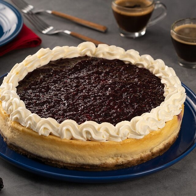 PASTEL DE QUESO ELBORADO A BASE DE GALLETA HORNEADO, CUBIERTO CON MERMELADA DE ZARZAMORA
