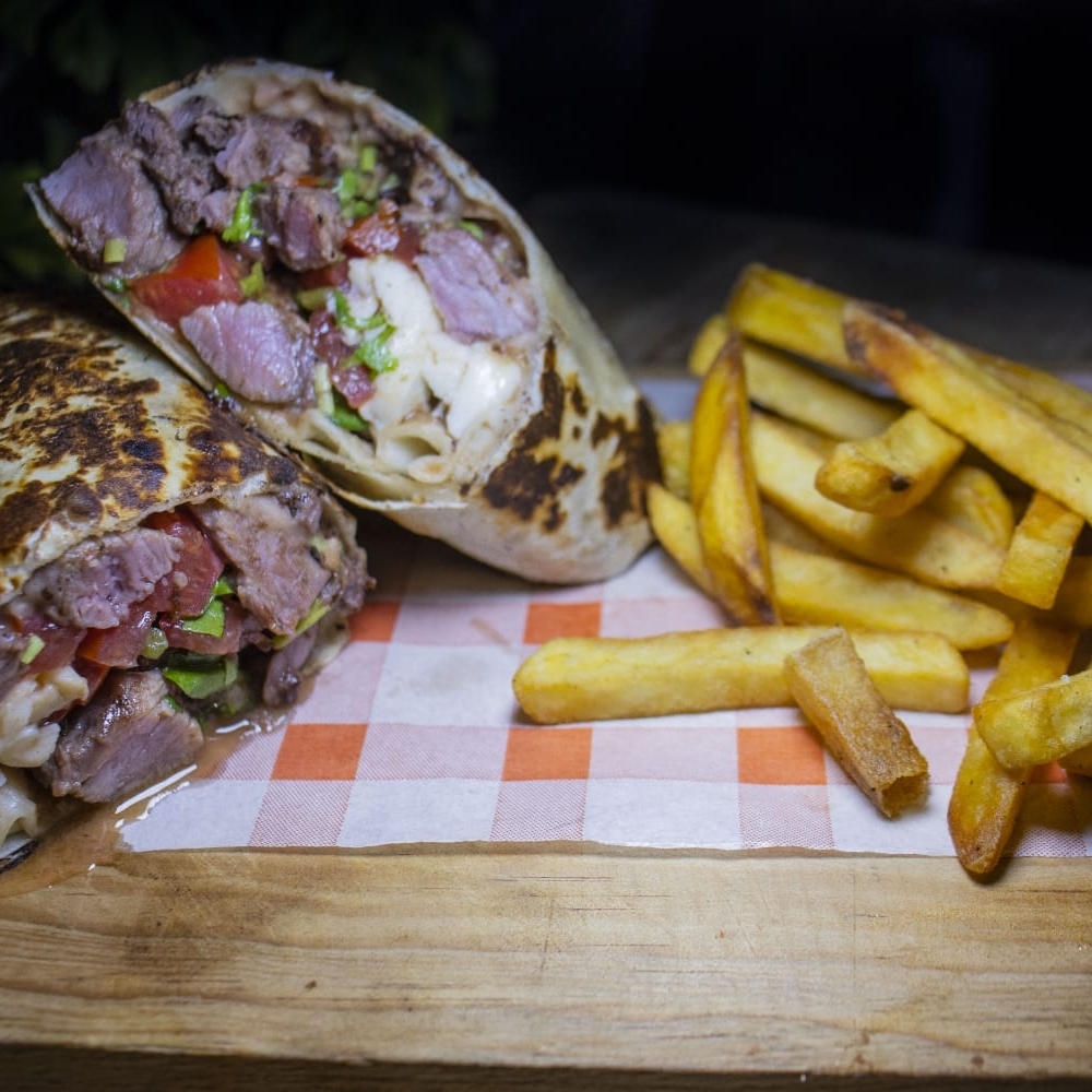 TORTILLA DE HARINA GRANDE, FRIJOLES REFRITOS, BISTEK, PICO DE GALLO, QUESILLO, ACOMPAÑADO DE PAPAS A LA FRANCESA Y GUACAMOLE