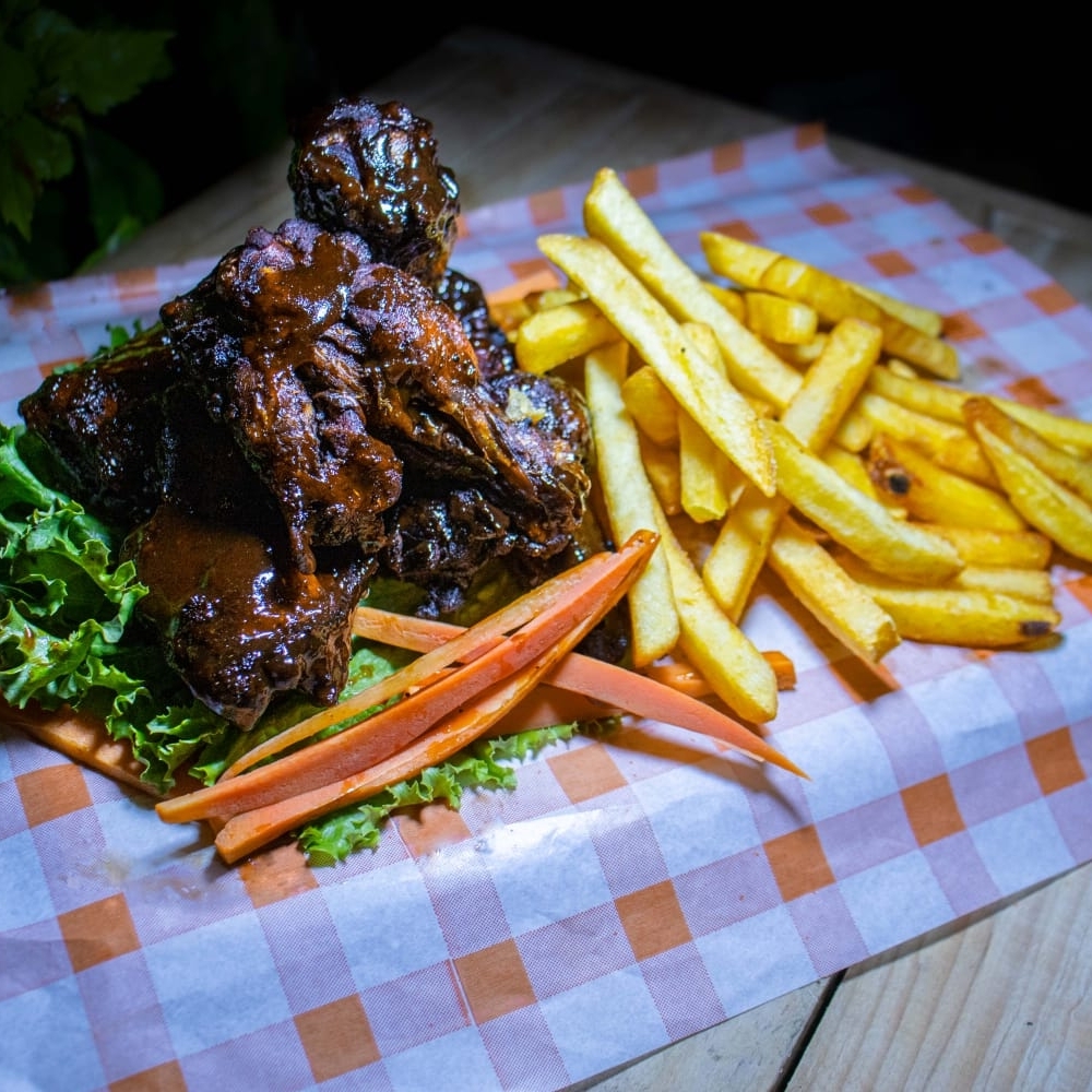 6 PZ DE ALITAS ADOBADAS BAÑADAS EN SALSA BBQ, SOBRE UNA CAPA DE LECHUGA Y BASTONES DE ZANAHORIA, ACOMPAÑADA DE PAPAS A LA FRANCESA