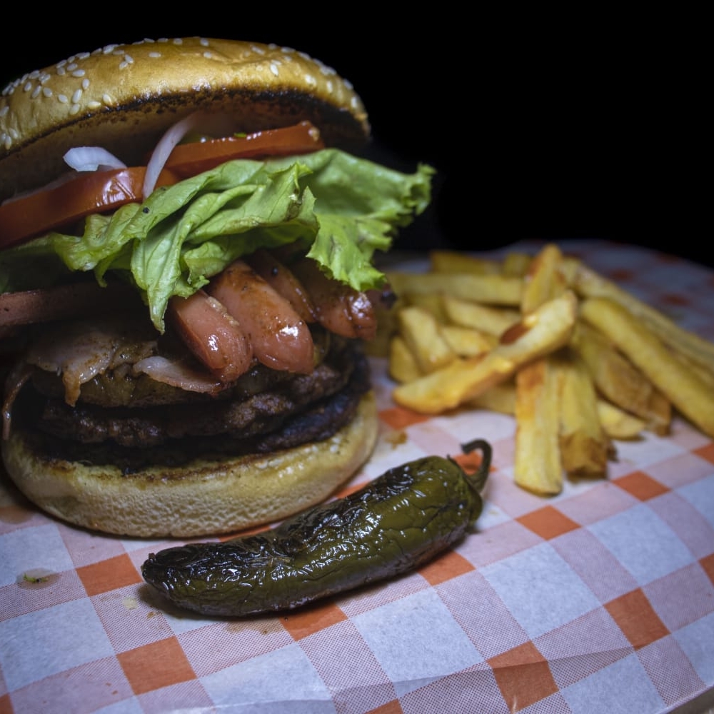 HAMBURGUESA DE RES, TOCINO,QUESILLO, JAMÓN, SALCHICHA, PIÑA, VERDURAS, ADEREZOS, ACOMPAÑADA DE PAPAS A LA FRANCESA