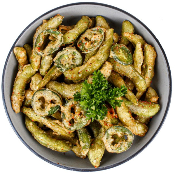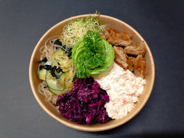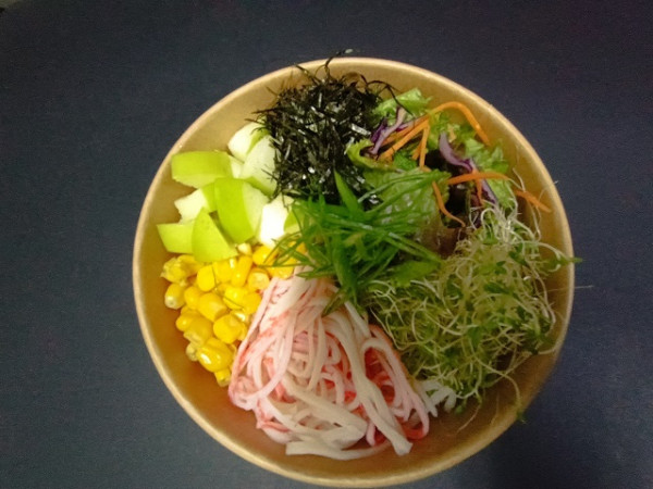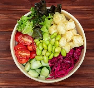 Shari Jitomate cherry Green mix Edamames Pepino Col encurtida Tofu Pasta tempura Dip de cilantro