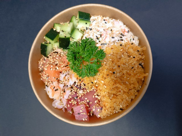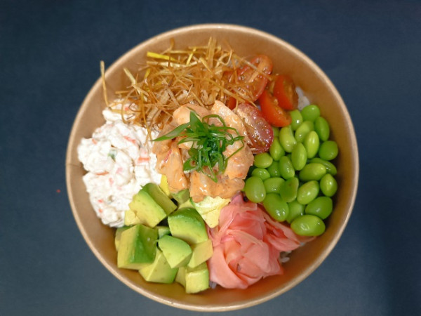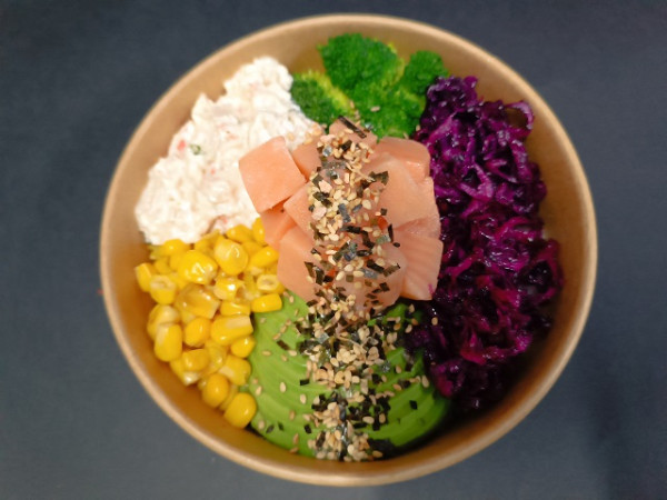 ARROZ SHARI/SALMÒN FRESCO(50GR), BROCOLI/COL ENCURTIDA/AGUACATE, GRANO DE ELOTE/PASTA TAMPICO Y FURIKAKE DE SALMÒN CON SALSA DE TU ELECCIÒN (CHIPOTLE/SPICY O DIP DE CILANTRO)