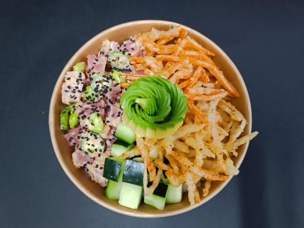 ARROZ SHARI/ATÙN (60 GR)/EDAMAMES/CHILE SERRANO/SALSA ACEVICHADA, PEPINO/KAKIAGUE DE ZANAHORIA/CEBOLLA TEMPURA CON PIMIENTA LIMON, AJONJOLI NEGRO Y AGUACATE CON SALSA DE TU ELECCIÒN (CHIPOTLE/SPICY O DIP DE CILANTRO)