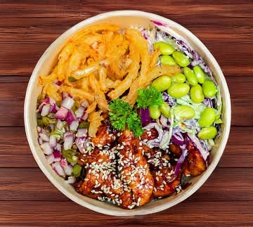 ARROZ SHARI/POLLO DIABLO(60 GR)/SALSA TERIYAKI DIABLO, COL MORADA/COL BLANCA/EDAMAME/SALSA ACEVICHADA, SALSA JALAPEÑO/CEBOLLA TEMPURA/AJONJOLI Y CEBOLLÌN CON SALSA DE TU ELECCIÒN (CHIPOTLE/SPICY O DIP DE CILANTRO)