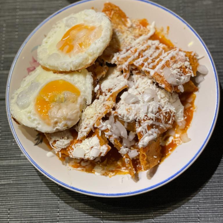 Bisquet relleno de chilaquiles verdes o rojos, crema, queso cotija, cebolla y un huevo estrellado o revuelto