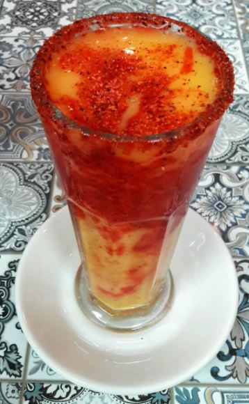 Mango o fresa, hielo, chamoy y miguelito.