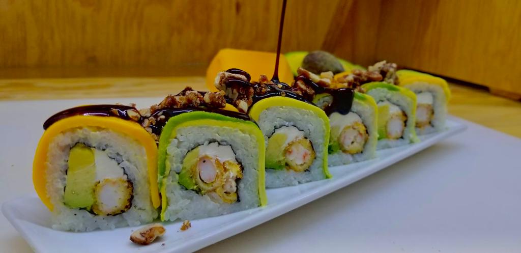 Sushi de 10 piezas, Por fuera mango, aguacate, nuez caramelizada y salsa dulce, por dentro queso philadelphia, camarón empanizado y aguacate.